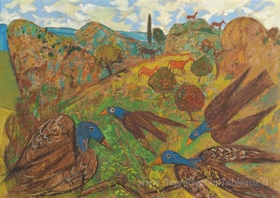 Nous vous proposons une reproduction artisanale sur toile du célèbre tableau 'Des oiseaux' de Grégoire Michonze, provenant du Musée de la Reproduction.