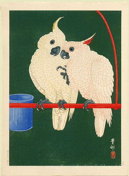 Nous vous proposons une reproduction artisanale sur toile du célèbre tableau 'Deux cacatotes blancs sur un bar rouge' de Ohara Koson, provenant du Musée de la Reproduction.