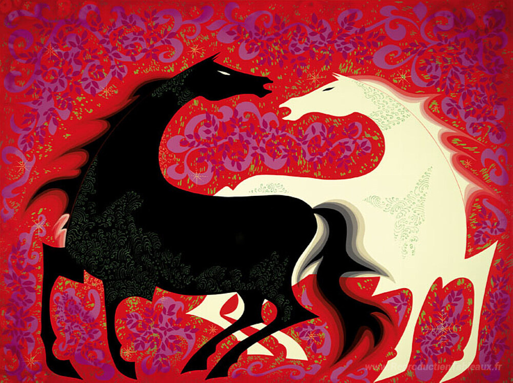 Nous vous proposons une reproduction artisanale sur toile du célèbre tableau 'Deux chevaux sauvages' de Eyvind Earle, provenant du Musée de la Reproduction.