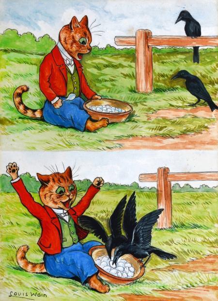Nous vous proposons une reproduction artisanale sur toile du célèbre tableau 'Deux corbeaux coquins' de Louis Wain, provenant du Musée de la Reproduction.