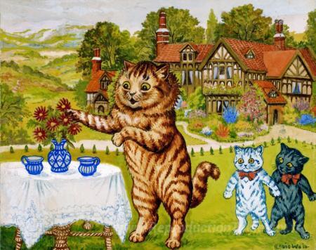 Nous vous proposons une reproduction artisanale sur toile du célèbre tableau 'Deux cruches de lait' de Louis Wain, provenant du Musée de la Reproduction.