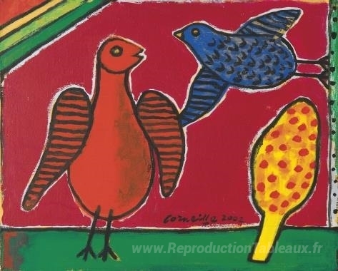 Nous vous proposons une reproduction artisanale sur toile du célèbre tableau 'Deux oiseaux' de Corneille, provenant du Musée de la Reproduction.