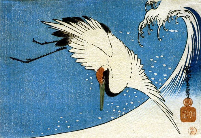Nous vous proposons une reproduction artisanale sur toile du célèbre tableau 'Grue et vague' de Hiroshige, provenant du Musée de la Reproduction.