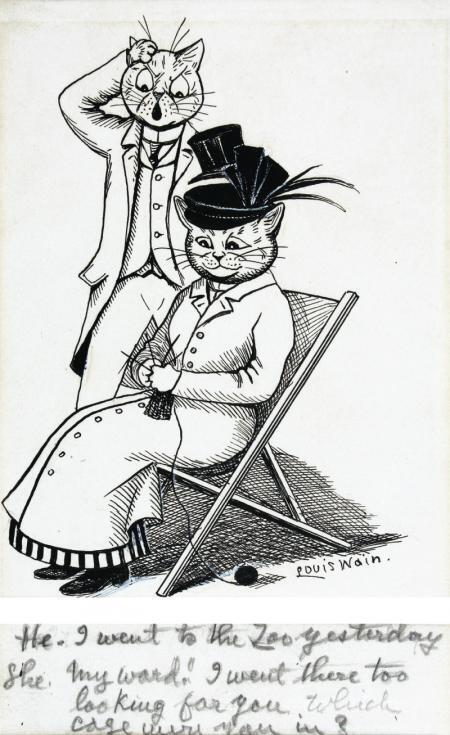 Nous vous proposons une reproduction artisanale sur toile du célèbre tableau 'Il - je suis allé au zoo hier, elle - ma parole! J'y suis allé t' de Louis Wain, provenant du Musée de la Reproduction.