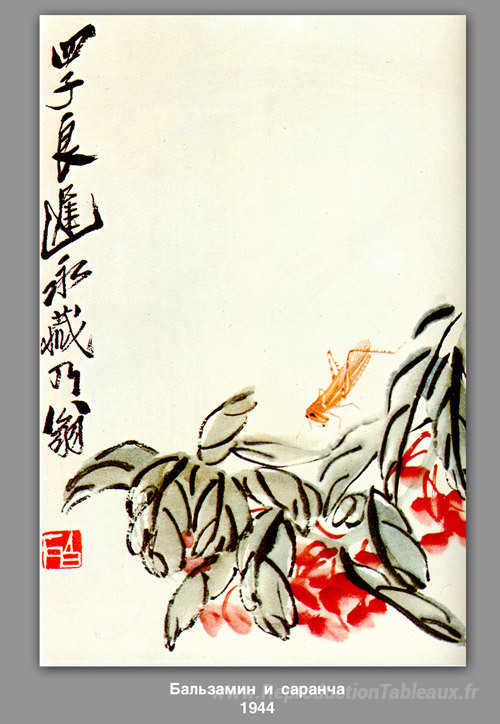 Nous vous proposons une reproduction artisanale sur toile du célèbre tableau 'Impatiens et criquets' de Qi Baishi, provenant du Musée de la Reproduction.