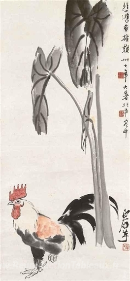 Nous vous proposons une reproduction artisanale sur toile du célèbre tableau 'Le coq et le taro part' de Xu Beihong, provenant du Musée de la Reproduction.