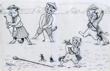 Nous vous proposons une reproduction artisanale sur toile du célèbre tableau 'Le putt' de Louis Wain, provenant du Musée de la Reproduction.