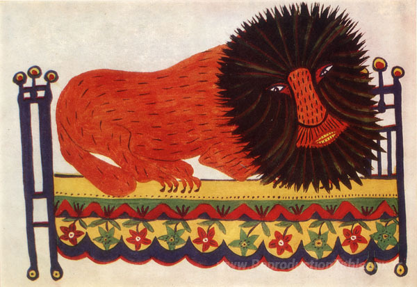 Nous vous proposons une reproduction artisanale sur toile du célèbre tableau 'Leone' de Maria Primachenko, provenant du Musée de la Reproduction.