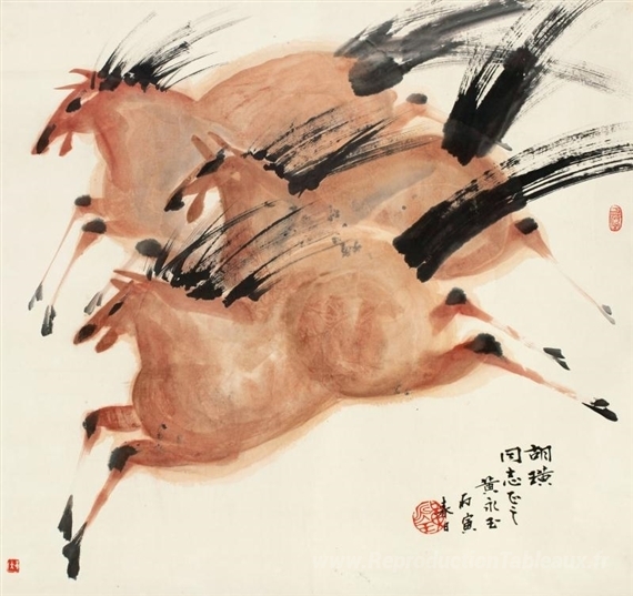 Nous vous proposons une reproduction artisanale sur toile du célèbre tableau 'Les chevaux' de Huang Yongyu, provenant du Musée de la Reproduction.
