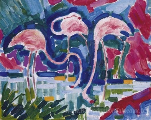 Nous vous proposons une reproduction artisanale sur toile du célèbre tableau 'Les Flamants' de Jean Metzinger, provenant du Musée de la Reproduction.