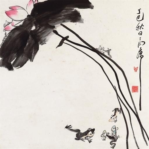 Nous vous proposons une reproduction artisanale sur toile du célèbre tableau 'Lotus et grenouilles' de Ding Yanyong, provenant du Musée de la Reproduction.