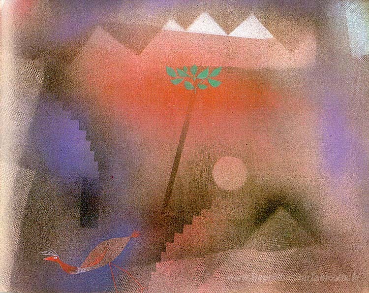 Nous vous proposons une reproduction artisanale sur toile du célèbre tableau 'Oiseau errant' de Paul Klee, provenant du Musée de la Reproduction.