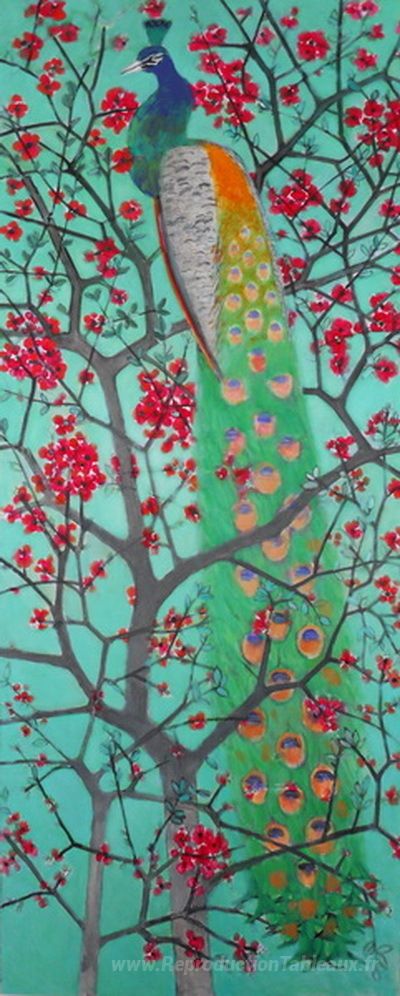 Nous vous proposons une reproduction artisanale sur toile du célèbre tableau 'Paon' de Viorel Marginean, provenant du Musée de la Reproduction.