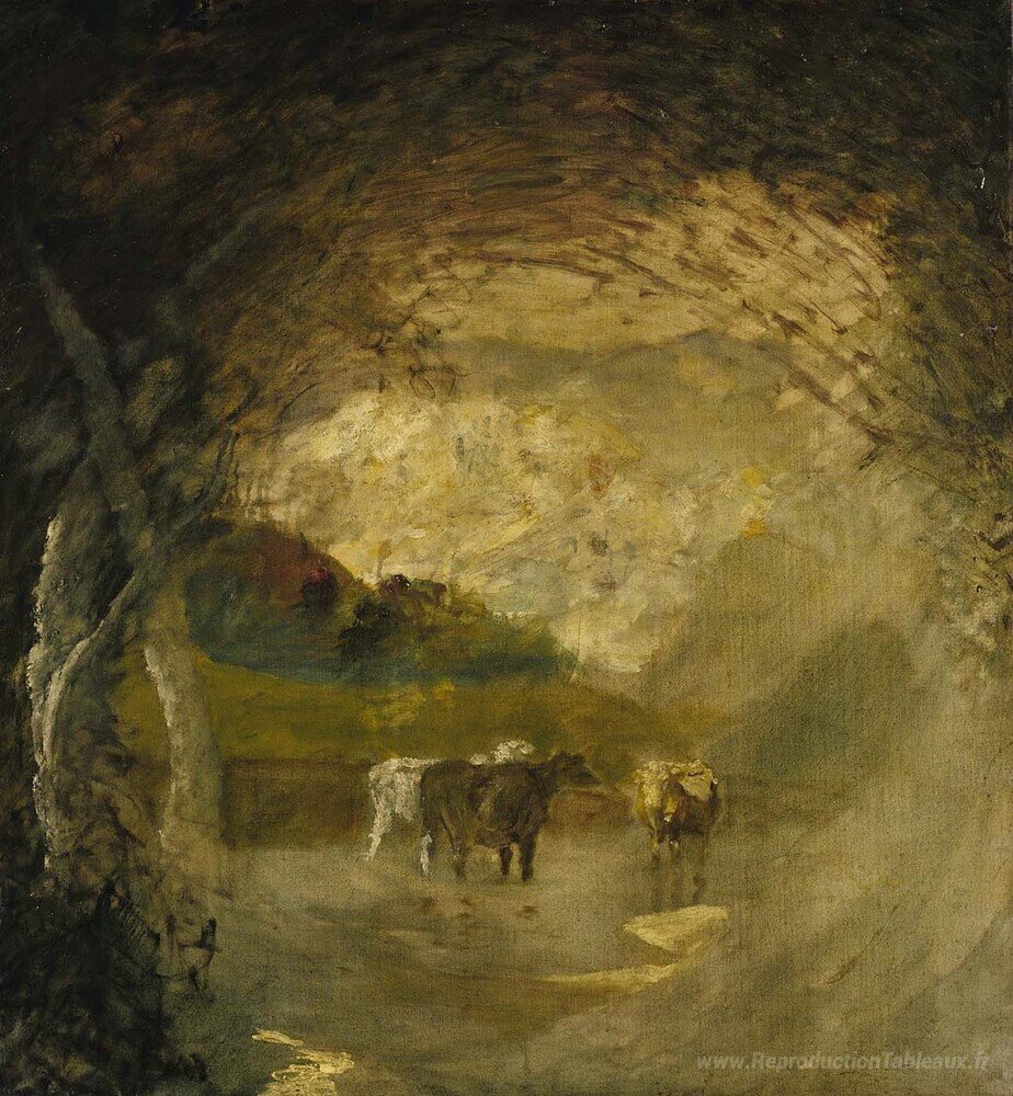 Nous vous proposons une reproduction artisanale sur toile du célèbre tableau 'Paysage avec des arbres et des bovins' de Albert Pinkham Ryder, provenant du Musée de la Reproduction.