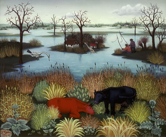 Nous vous proposons une reproduction artisanale sur toile du célèbre tableau 'Paysage fluvial' de Ivan Generalic, provenant du Musée de la Reproduction.
