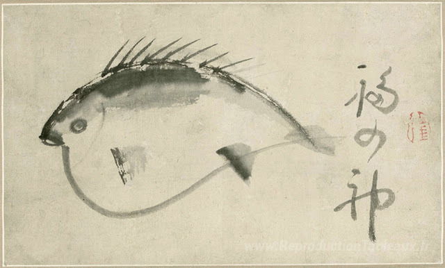 Nous vous proposons une reproduction artisanale sur toile du célèbre tableau 'Poisson' de Sengai, provenant du Musée de la Reproduction.