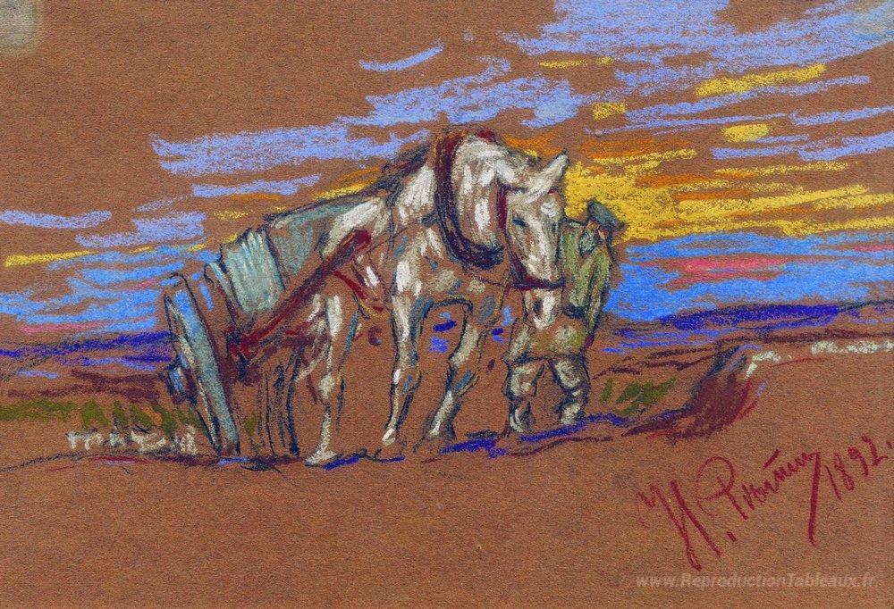 Nous vous proposons une reproduction artisanale sur toile du célèbre tableau 'Porter à cheval' de Ilya Repin, provenant du Musée de la Reproduction.