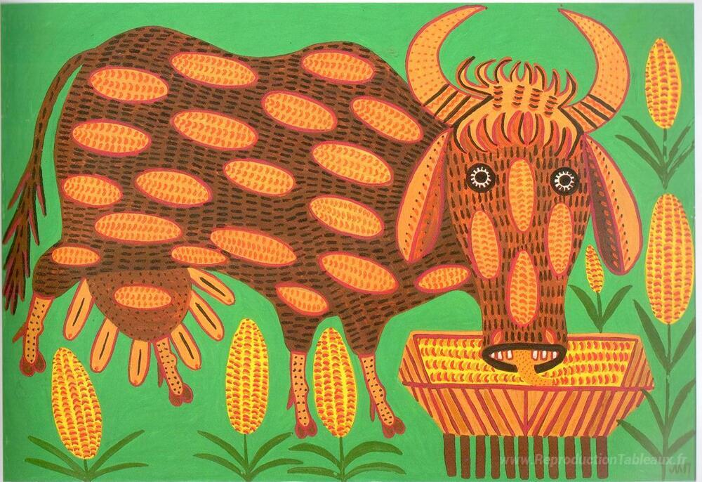 Nous vous proposons une reproduction artisanale sur toile du célèbre tableau 'Une vache comme ça donne 5 000 litres par jour' de Maria Primachenko, provenant du Musée de la Reproduction.