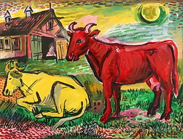 Nous vous proposons une reproduction artisanale sur toile du célèbre tableau 'Vaches rouges et jaunes' de David Burliuk, provenant du Musée de la Reproduction.