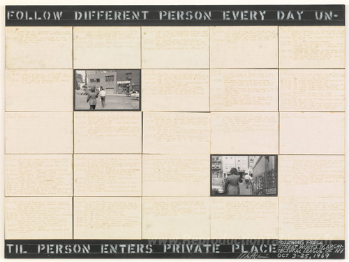 Nous vous proposons une reproduction artisanale sur toile du célèbre tableau 'Pièce suivante' de Vito Acconci, provenant du Musée de la Reproduction.