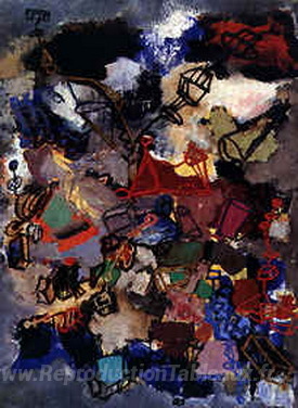 Nous vous proposons une reproduction artisanale sur toile du célèbre tableau 'Ivresse à Verdun' de Giuseppe Pinot-Gallizio, provenant du Musée de la Reproduction.