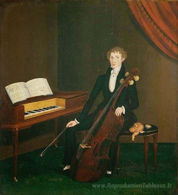 Nous vous proposons une reproduction artisanale sur toile du célèbre tableau 'Le violoncelliste' de John Bradley, provenant du Musée de la Reproduction.
