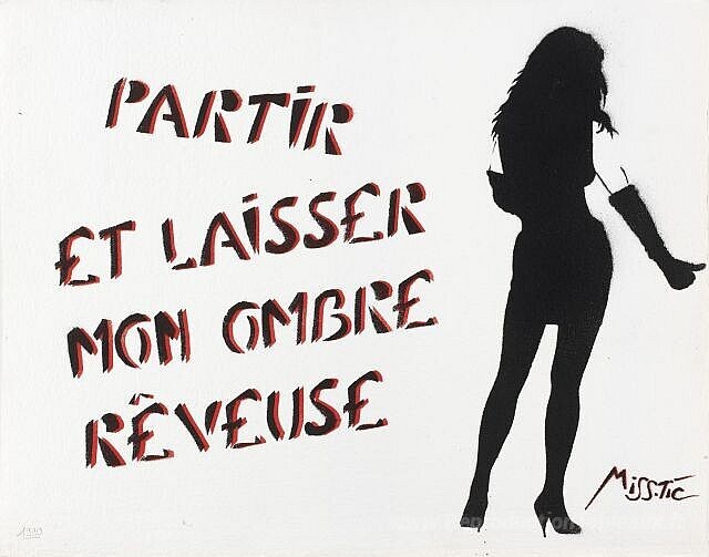 Nous vous proposons une reproduction artisanale sur toile du célèbre tableau 'Partier et laisser mon ombre rêveuse' de Miss.Tic, provenant du Musée de la Reproduction.