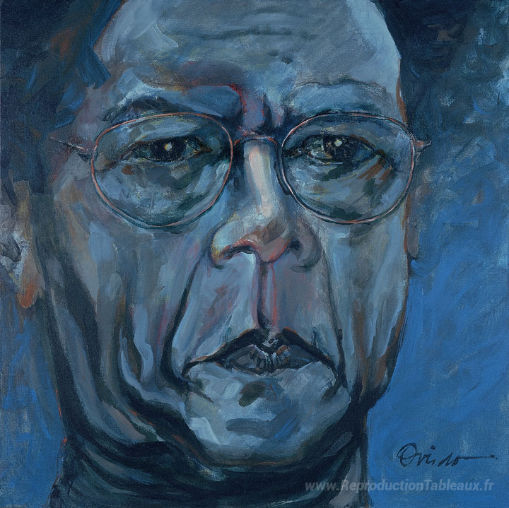 Nous vous proposons une reproduction artisanale sur toile du célèbre tableau 'Auto Retrato en Azul (auto-portrait en bleu)' de Ramon Oviedo, provenant du Musée de la Reproduction.