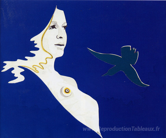 Nous vous proposons une reproduction artisanale sur toile du célèbre tableau 'Autoportrait à l'oiseau vert ou femme à l'oiseau vert' de Evelyne Axell, provenant du Musée de la Reproduction.