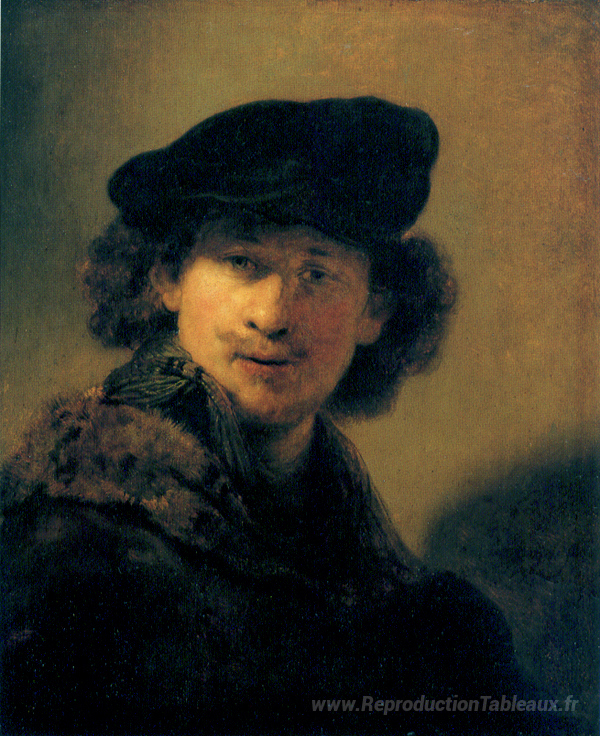 Nous vous proposons une reproduction artisanale sur toile du célèbre tableau 'Autoportrait avec béret' de Rembrandt, provenant du Musée de la Reproduction.