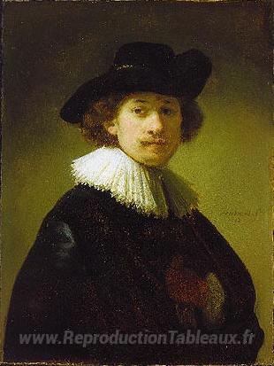 Nous vous proposons une reproduction artisanale sur toile du célèbre tableau 'Autoportrait avec chapeau' de Rembrandt, provenant du Musée de la Reproduction.