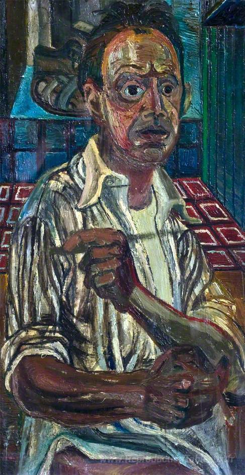 Nous vous proposons une reproduction artisanale sur toile du célèbre tableau 'Autoportrait avec des sandales' de John Bratby, provenant du Musée de la Reproduction.