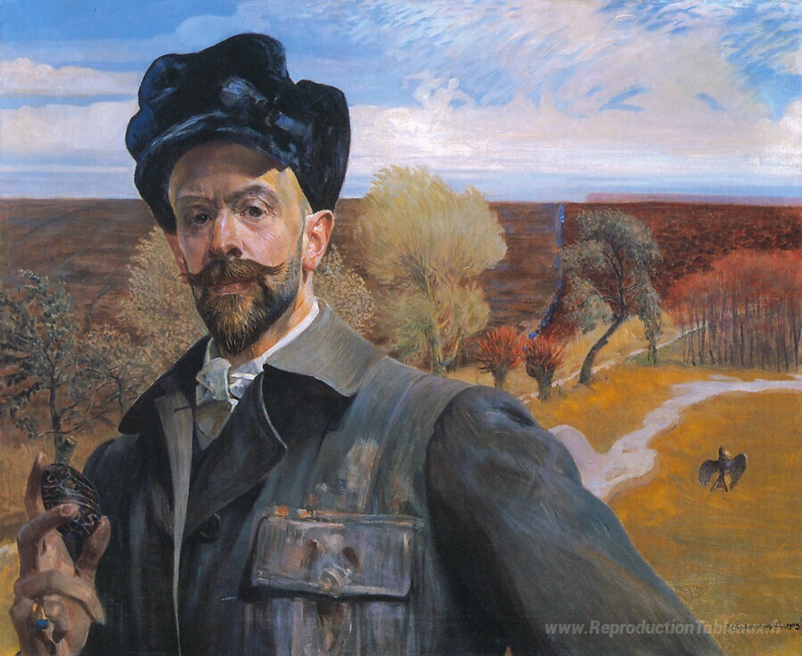 Nous vous proposons une reproduction artisanale sur toile du célèbre tableau 'Autoportrait avec Pisanka' de Jacek Malczewski, provenant du Musée de la Reproduction.