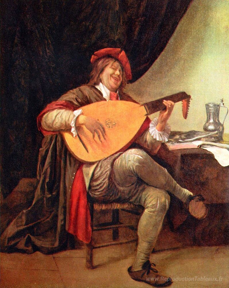 Nous vous proposons une reproduction artisanale sur toile du célèbre tableau 'Autoportrait avec un luth' de Jan Steen, provenant du Musée de la Reproduction.