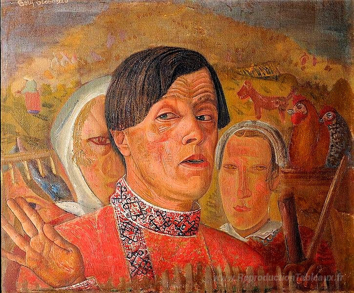 Nous vous proposons une reproduction artisanale sur toile du célèbre tableau 'Autoportrait avec un poulet et un coq' de Boris Grigoriev, provenant du Musée de la Reproduction.
