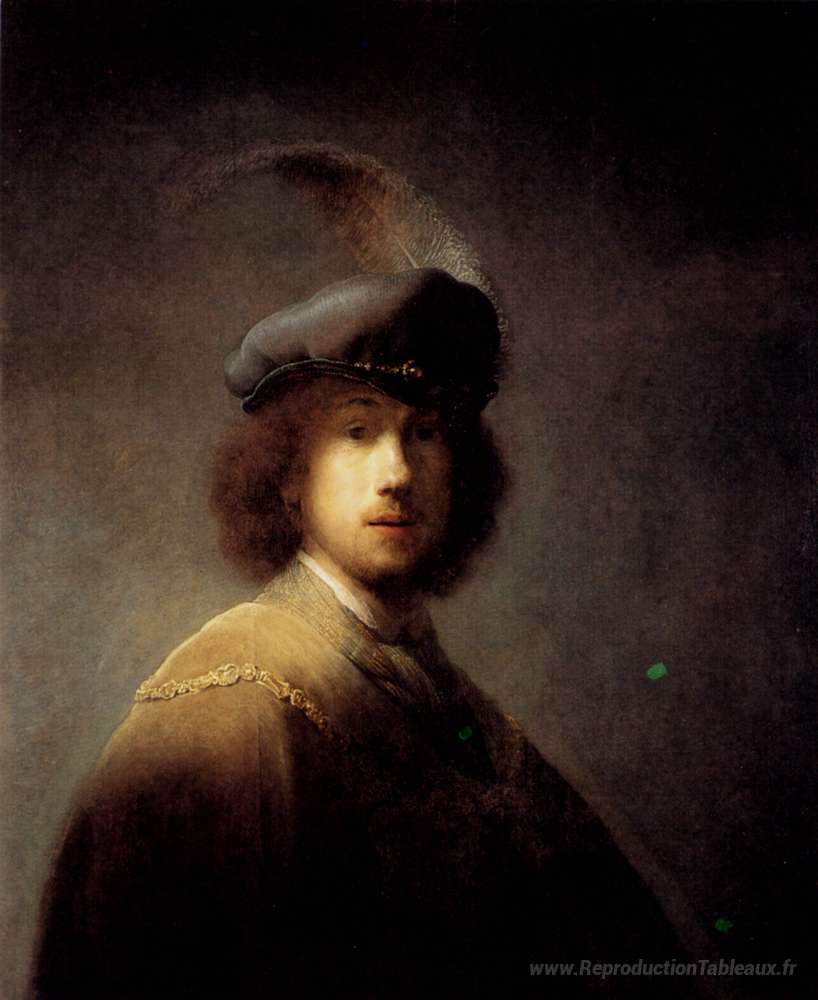 Nous vous proposons une reproduction artisanale sur toile du célèbre tableau 'Autoportrait dans un chapeau à plumes' de Rembrandt, provenant du Musée de la Reproduction.