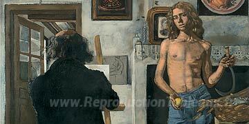 Nous vous proposons une reproduction artisanale sur toile du célèbre tableau 'Autoportrait de peintre avec son modèle' de Yiannis Tsaroychis, provenant du Musée de la Reproduction.