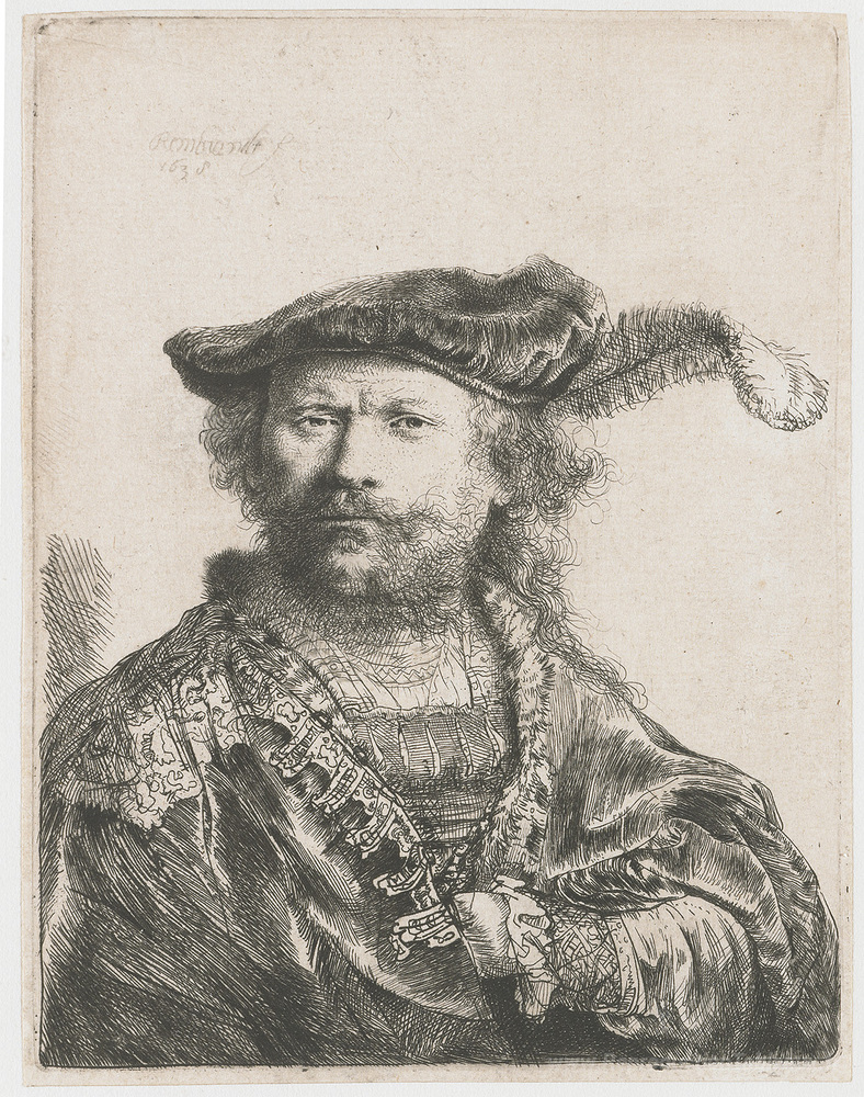 Nous vous proposons une reproduction artisanale sur toile du célèbre tableau 'Autoportrait en capuchon et panache de velours' de Rembrandt, provenant du Musée de la Reproduction.