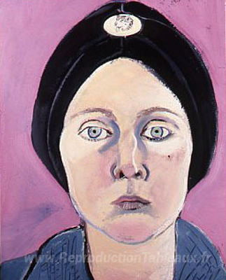 Nous vous proposons une reproduction artisanale sur toile du célèbre tableau 'Autoportrait en turban avec épingle à chiens eskimo' de Joan Brown, provenant du Musée de la Reproduction.