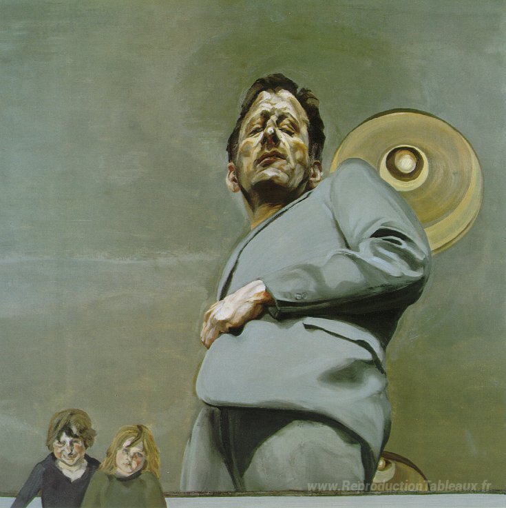 Nous vous proposons une reproduction artisanale sur toile du célèbre tableau 'Réflexion avec deux enfants (autoportrait)' de Lucian Freud, provenant du Musée de la Reproduction.