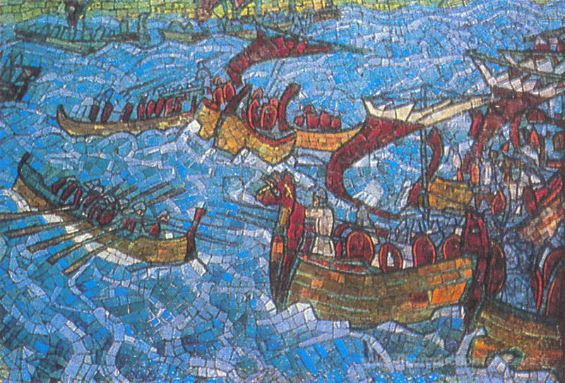 Nous vous proposons une reproduction artisanale sur toile du célèbre tableau 'Bataille' de Nicholas Roerich, provenant du Musée de la Reproduction.