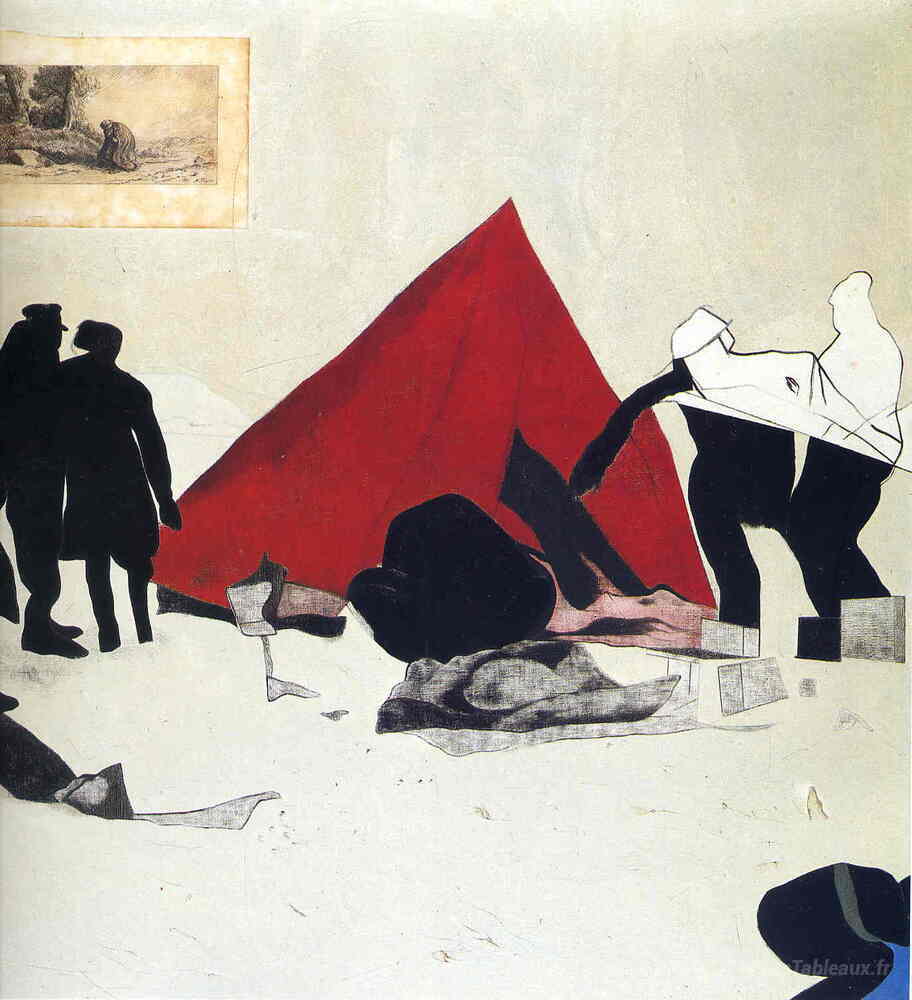 Nous vous proposons une reproduction artisanale sur toile du célèbre tableau 'Démontage de la tente rouge' de R. B. Kitaj, provenant du Musée de la Reproduction.