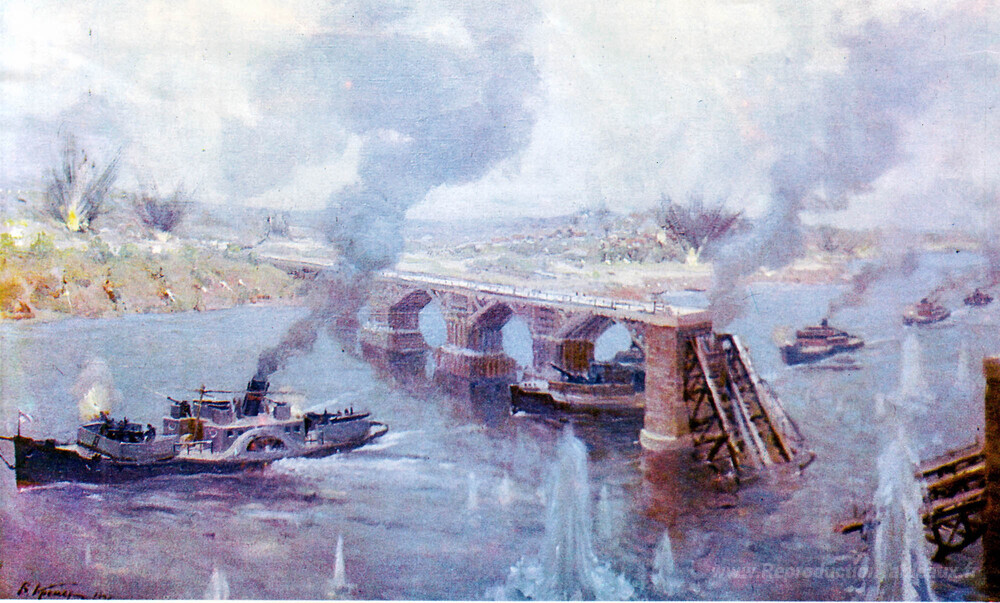 Nous vous proposons une reproduction artisanale sur toile du célèbre tableau 'Percée de la flotte militaire DNEPR à Loyev pendant la guerre po' de Veniamin Kremer, provenant du Musée de la Reproduction.