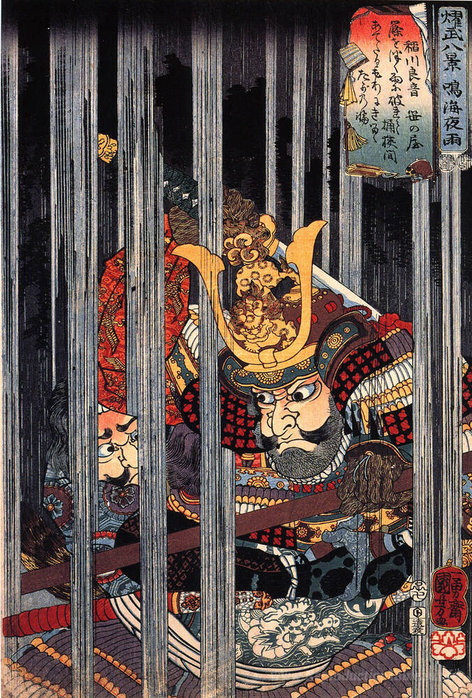 Nous vous proposons une reproduction artisanale sur toile du célèbre tableau 'Pluie de nuit à Narumi' de Utagawa Kuniyoshi, provenant du Musée de la Reproduction.