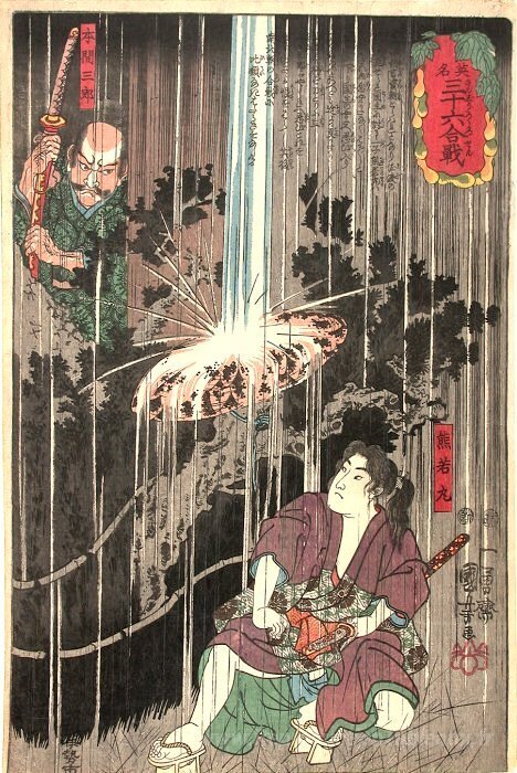 Nous vous proposons une reproduction artisanale sur toile du célèbre tableau 'Trente-six batailles célèbres' de Utagawa Kuniyoshi, provenant du Musée de la Reproduction.