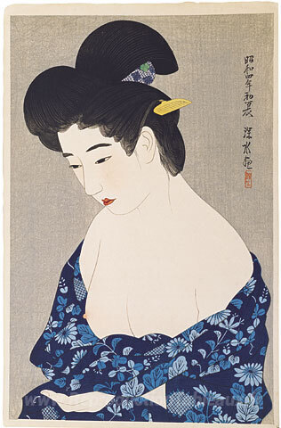 Nous vous proposons une reproduction artisanale sur toile du célèbre tableau 'Après le bain' de Ito Shinsui, provenant du Musée de la Reproduction.