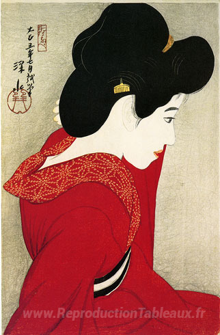 Nous vous proposons une reproduction artisanale sur toile du célèbre tableau 'Avant le miroir' de Ito Shinsui, provenant du Musée de la Reproduction.