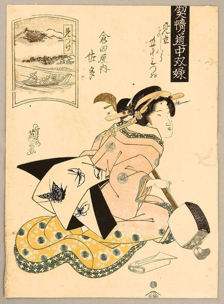 Nous vous proposons une reproduction artisanale sur toile du célèbre tableau 'Beauté et shamisen' de Keisai Eisen, provenant du Musée de la Reproduction.