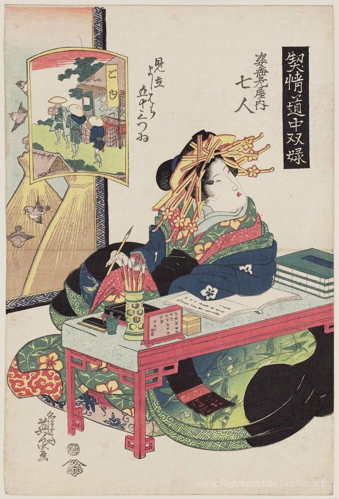 Nous vous proposons une reproduction artisanale sur toile du célèbre tableau 'Goyu: nanahito des sugata-ebiya' de Keisai Eisen, provenant du Musée de la Reproduction.