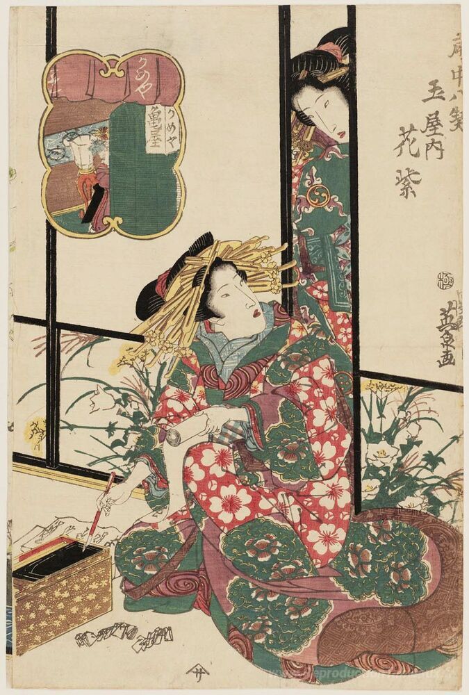 Nous vous proposons une reproduction artisanale sur toile du célèbre tableau 'Hanamurasaki du Tamaya, de la série huit vues des quartiers de p' de Keisai Eisen, provenant du Musée de la Reproduction.